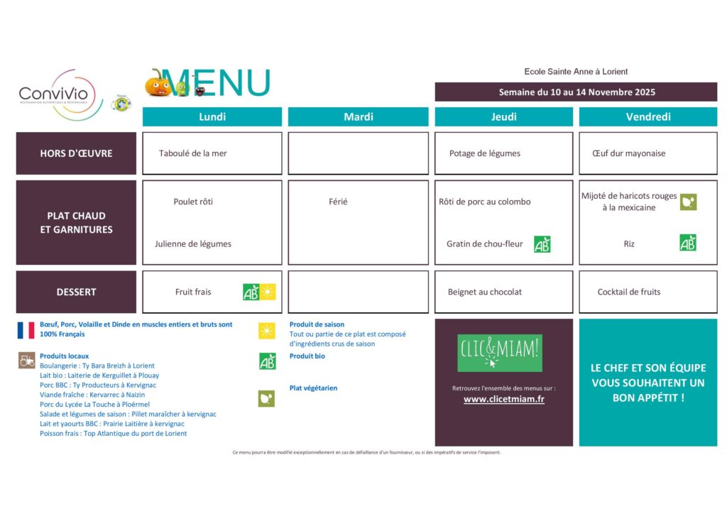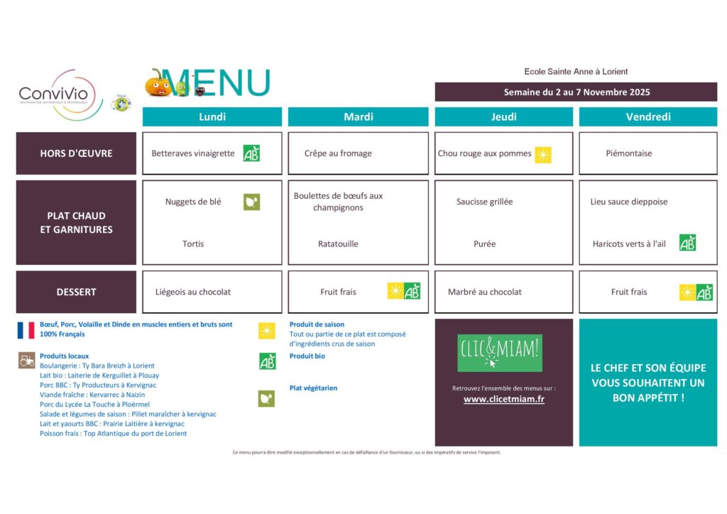 Menu de la cantine