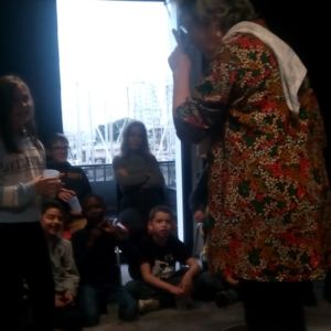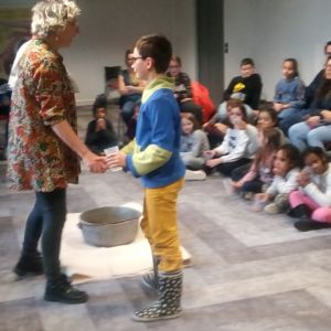 L’histoire est tirée d’un conte chinois « la soupe aux cailloux ». La comédienne a adapté cette histoire à la ville de Lorient « L’O R I E N T ». Depuis bien longtemps les villageois de notre ville ne sortent plus. Ils vont se réunir sur la place de la ville pour préparer une bonne soupe. Nous l’avons dégustée à la fin. C’était très amusant…