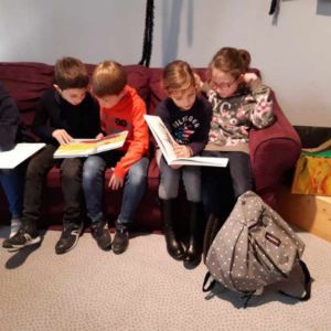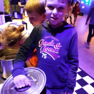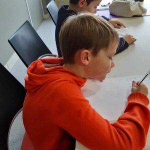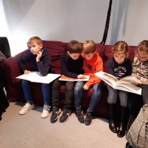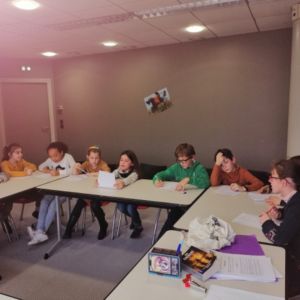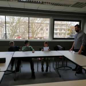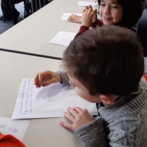 Quand nous sommes arrivés, la maîtresse nous a partagé en deux groupes. Le premier a fait un atelier d’écriture avec un animateur, Norman. Il fallait créer un conte culinaire : inventer un héros avec un nom rigolo, qui devait s’inscrire à un concours de cuisine et le gagner grâce à une recette originale. Le deuxième groupe pendant ce temps-là, est parti à la découverte du salon et a pu profiter d’une histoire mise en voix par des animateurs. Ensuite, les deux groupes ont permuté les activités.