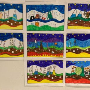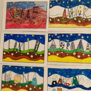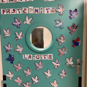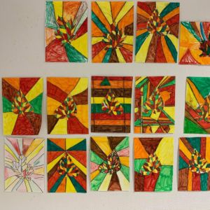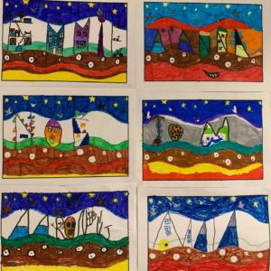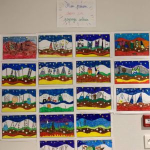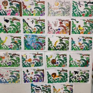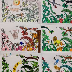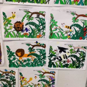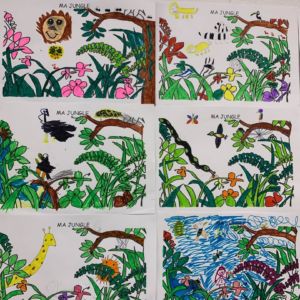 Travail autour des feuilles et des couleurs d’automne, travail autour du prénom et de l’espace urbain, production sur les valeurs de la République. Puis en lien avec notre projet d’année ” apprendre par la nature”, les élèves ont créé leurs jungles puis ils ont imaginé leur “forêt enchantée”.