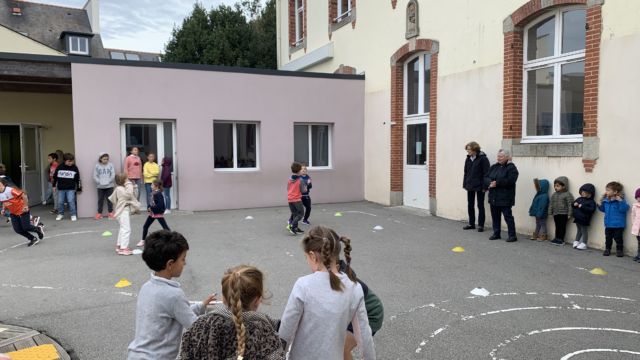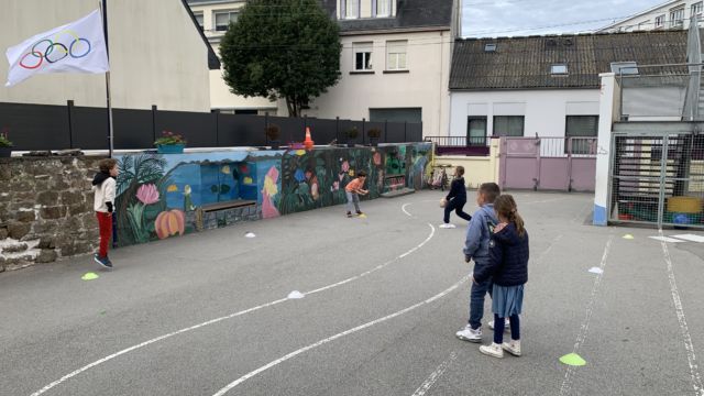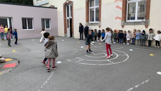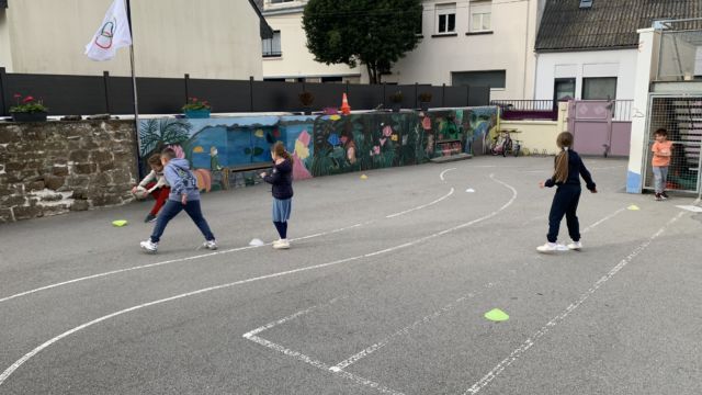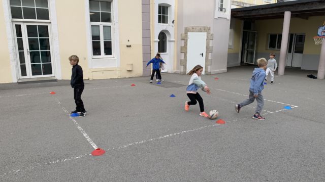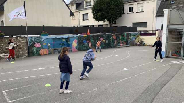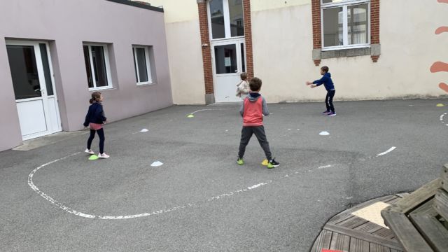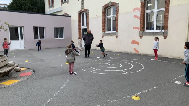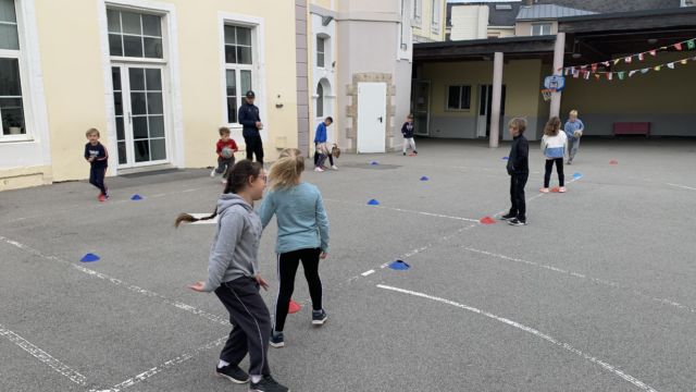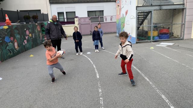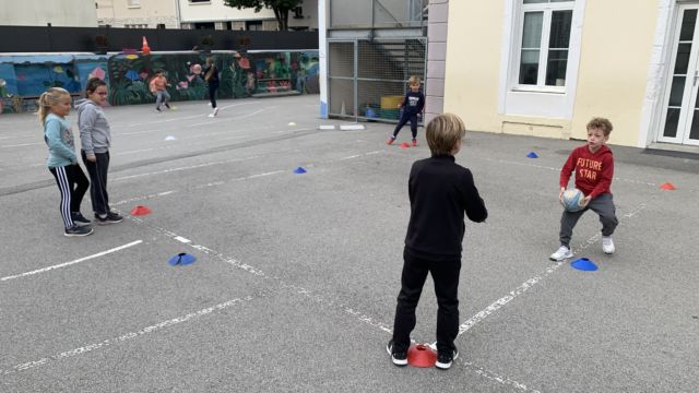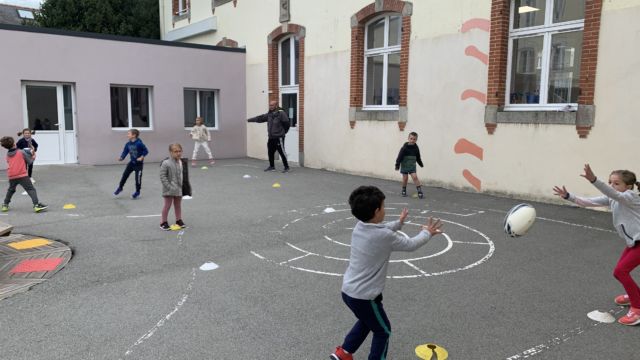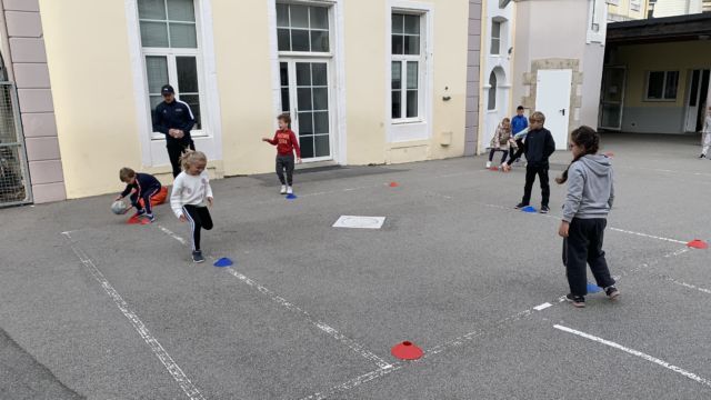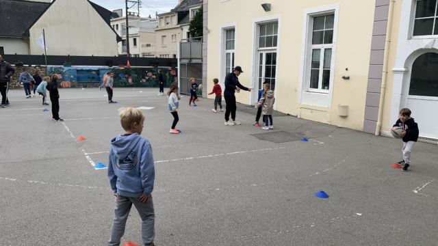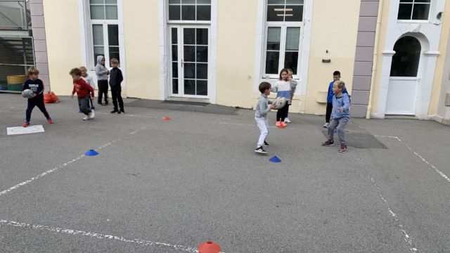 Pour clôturer notre cycle de sport autour du rugby, nous avons accueilli 2 éducateurs sportifs du ROL de Lorient. Par équipe, nous avons retravaillé les passes, les courses de vitesse, les essais.