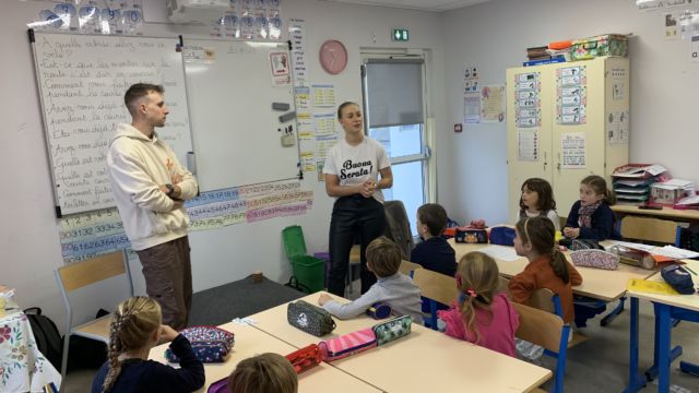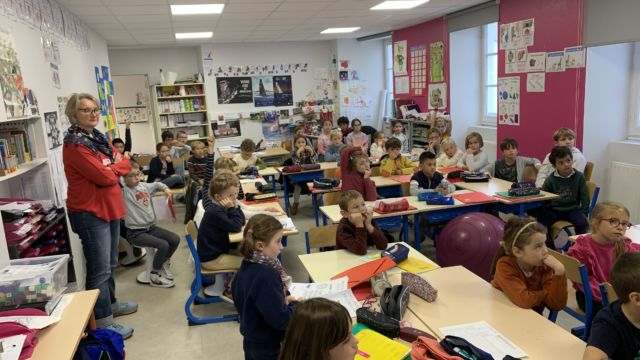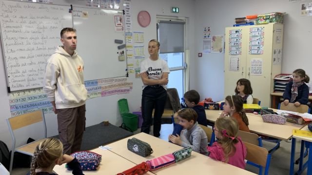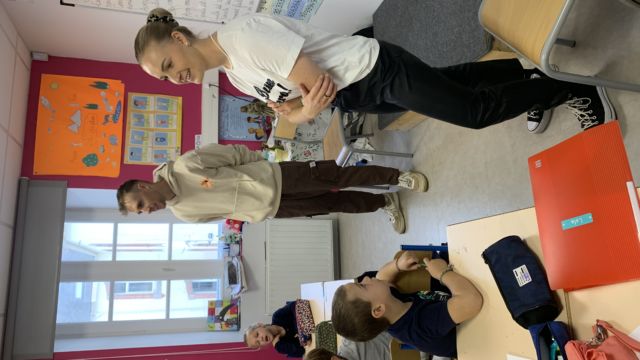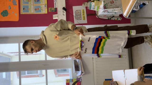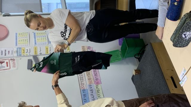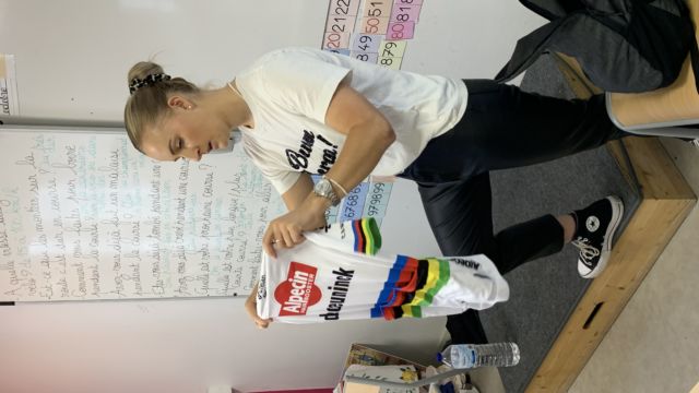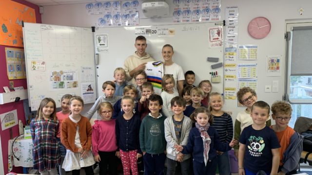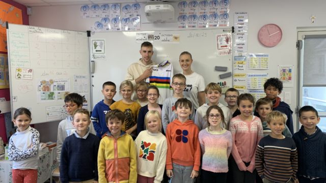 Ce matin nous avons eu l’honneur de recevoir à l école 2 champions cyclistes : Axel et Typhaine Laurence. Axel est champion du monde -23 ans et Typhaine championne de France , elle a finit 3eme au championnat du monde et a fait le Tour de France cet été .