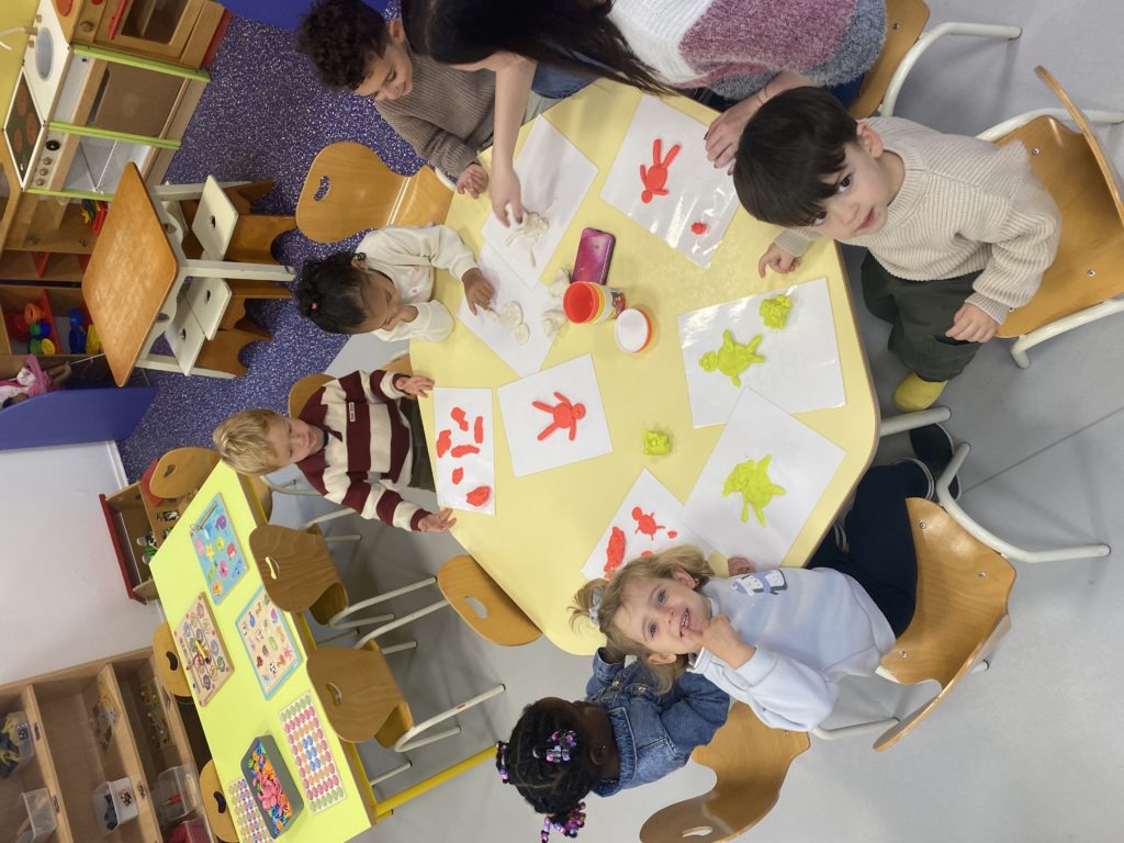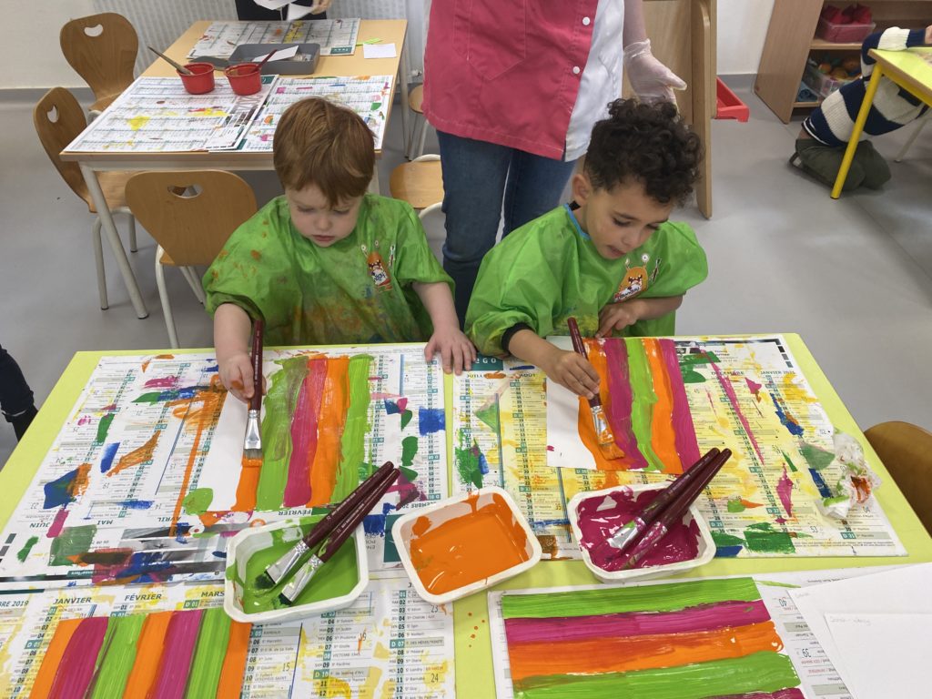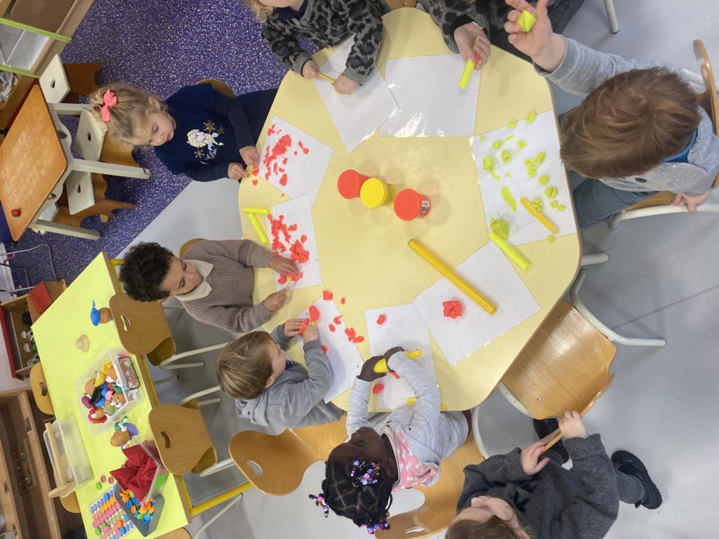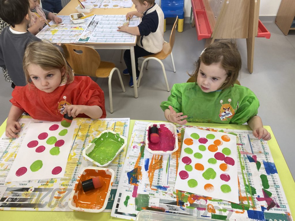 Les activités de pâte à modeler : on fait des escargots et des bonhommes. Et en peinture des lignes verticales et des points pour les TPS.