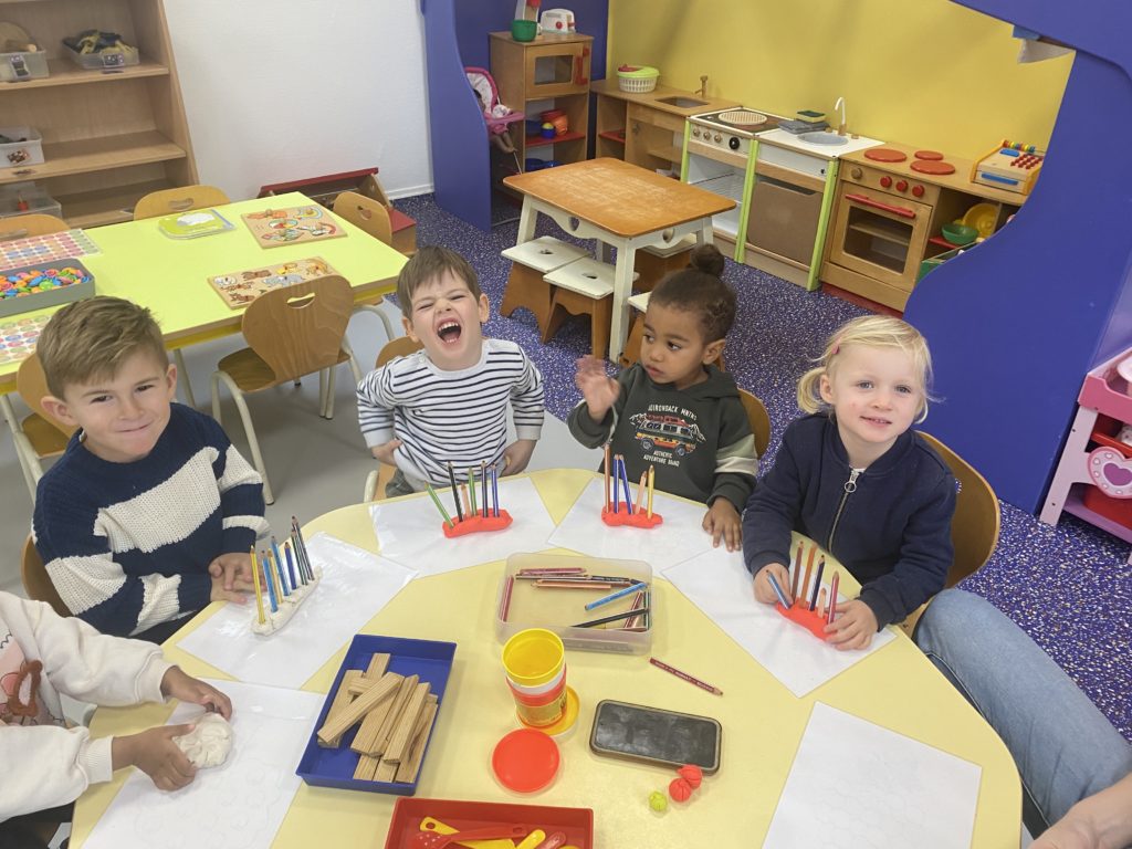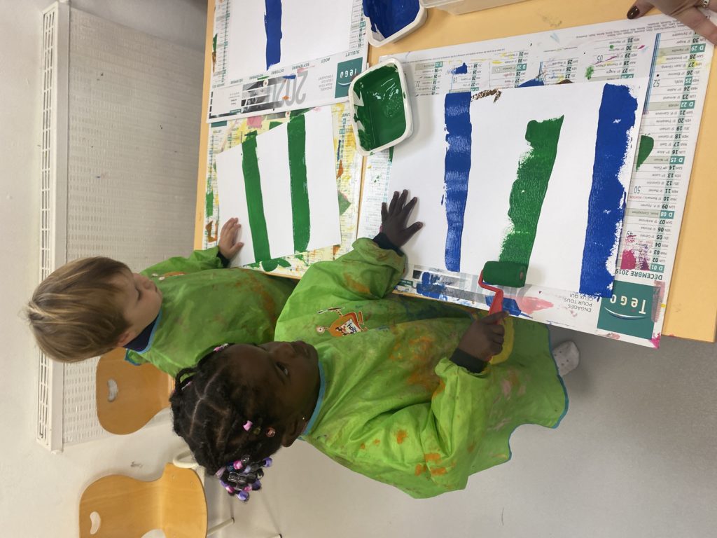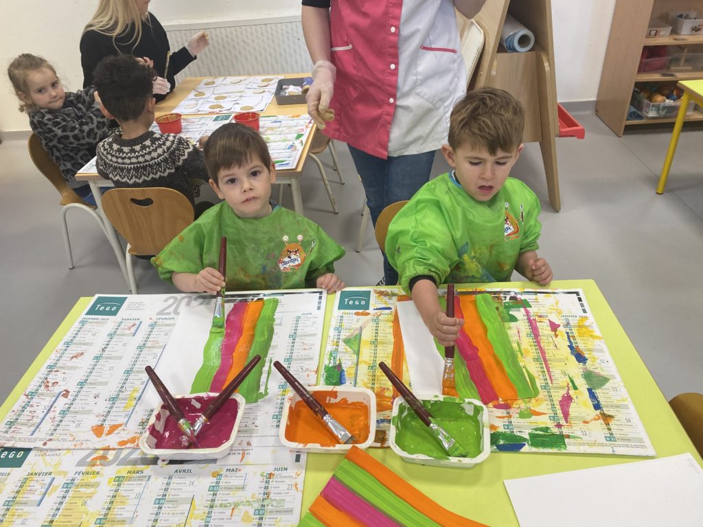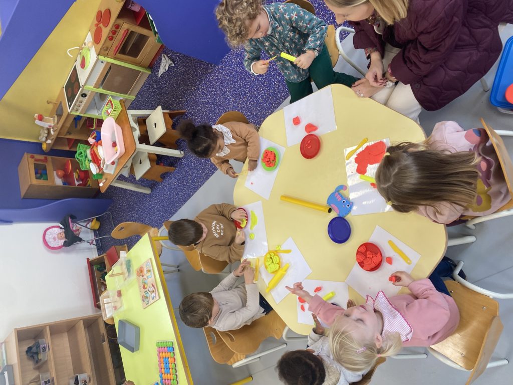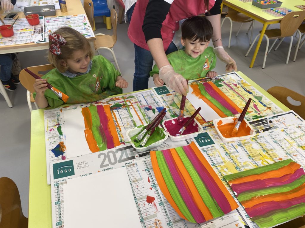 Les activités de pâte à modeler : on fait des escargots et des bonhommes. Et en peinture des lignes verticales et des points pour les TPS.