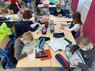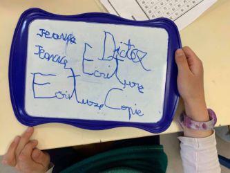 ” Chers enfants , Le président Monsieur Macron a demandé aux enseignantes d’apprendre aux enfants à écrire des 2 mains avant le confinement. Cette nouvelle compétence permettra ainsi aux élèves de pouvoir reposer une main quand elle sera fatiguée et de continuer le travail avec l’ autre .”