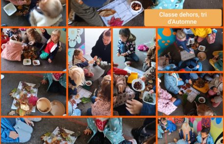 C’est l’Automne ! Après une belle récolte des familles pendant les vacances de la Toussaint, nous avons pu profite du préau pour un temps d’atelier dehors. Tri, classement,